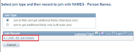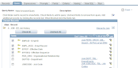 Bueno, esta pestaña no es solo para seleccionar campos de los registros, sino más que eso. Vea los varios enlaces de unión a la derecha, por ejemplo, el enlace ‘Join DEPT_TBL’ que nos permite unir otros registros con los registros agregados (TRABAJOS y NOMBRES en este caso) en función de la ocurrencia común de campos clave en estos registros. Por ejemplo, el trabajo de registros y DEPT_TBL se pueden unir en función de la existencia del campo DEPTID en ambas tablas y de que sea un campo clave en DEPT_TBL.