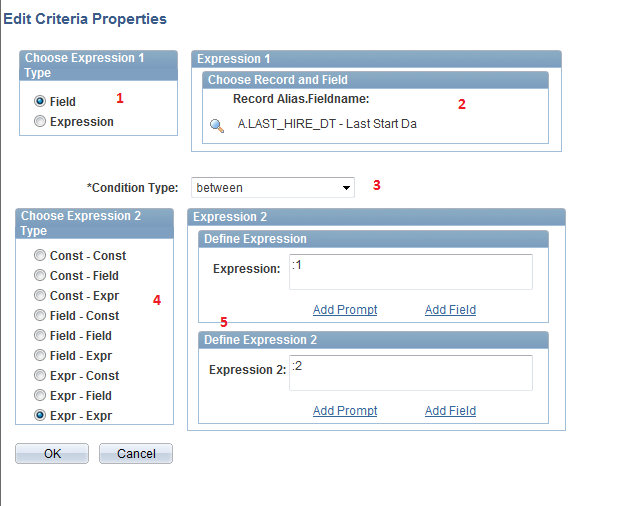 Completa todos los pasos marcados en rojo en secuencia. Recuerde que nuestro objetivo aquí es agregar los criterios ‘DÓNDE A. LAST_HIRE_DT ENTRE: 1 Y :2’ donde :1 y :2 son variables de enlace para De Fecha y Hasta Fecha, respectivamente, para que HRs pueda especificar el intervalo de fechas durante el cual se deben obtener las nuevas contrataciones en el informe.Haga clic en “Aceptar” y con esto se completará nuestra consulta PS.